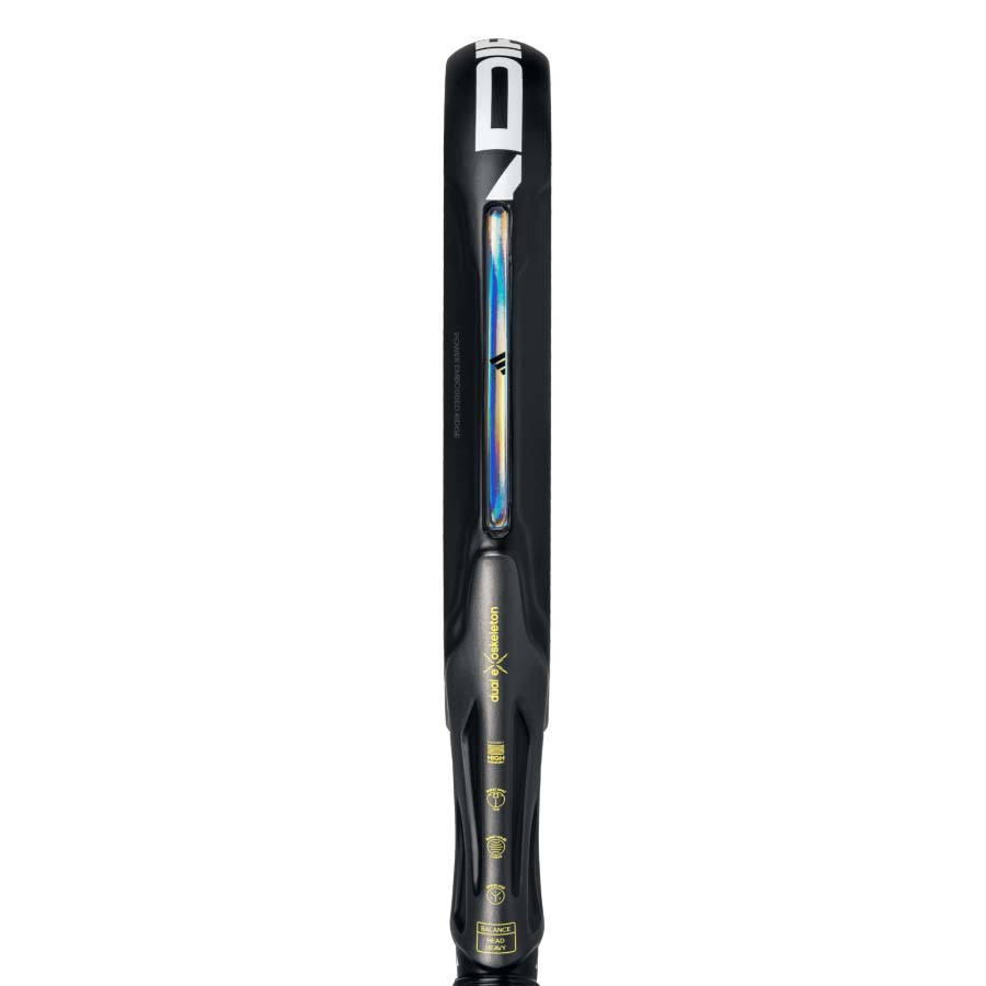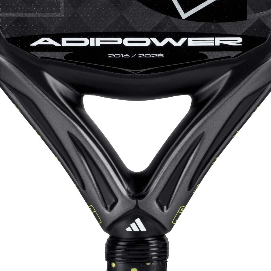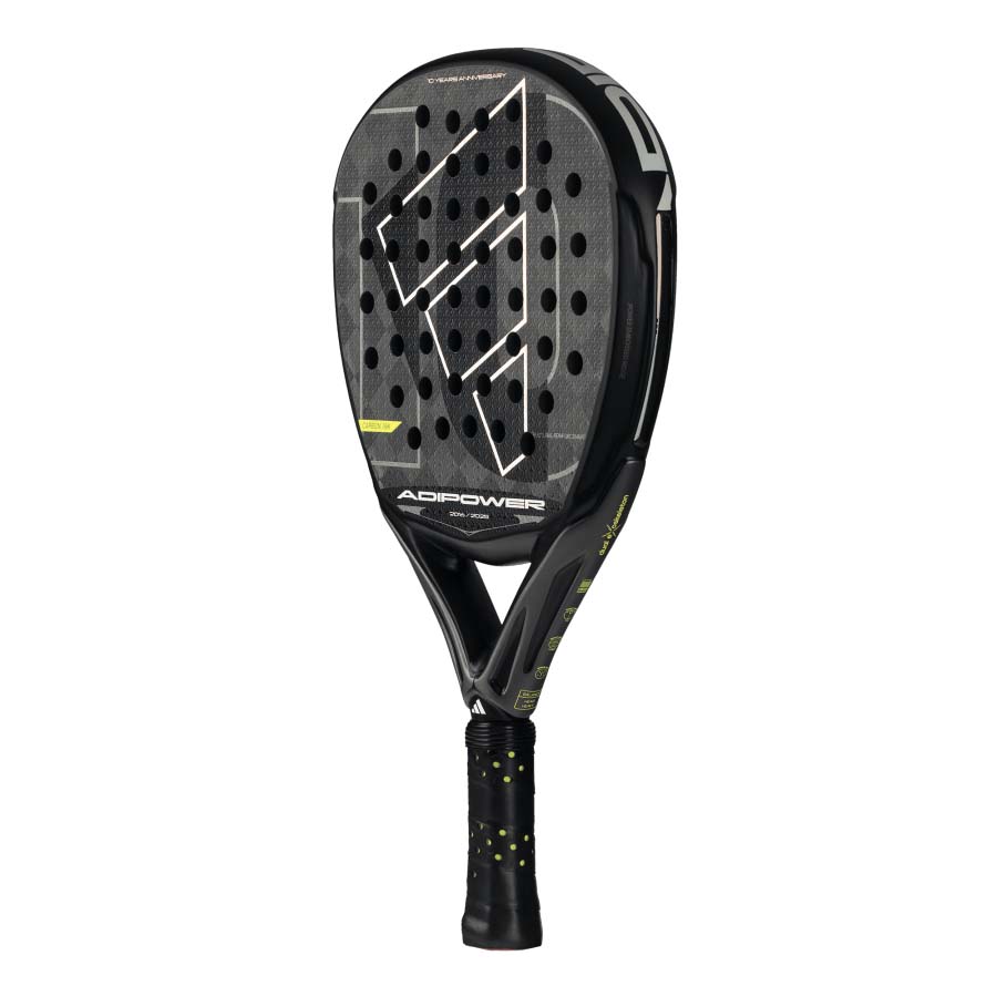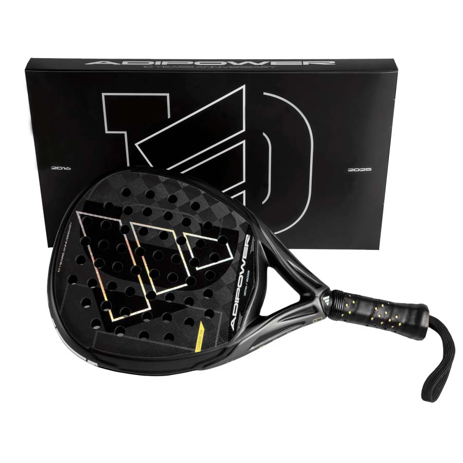 The Adidas Adipower 10th Anniversary Padel Racket pays tribute to 10 years of innovation, victory and unforgettable memories. The racket features a 3K carbon surface and Soft Performance EVA rubber, and offers the perfect balance between power and control. Its oversize diamond shape and technologies like Power Embossed Ridge, Smart Holes Curve and Spin Blade make it ideal for those looking to dominate the game with confidence.The Power Embossed Ridge is a double-height carbon rib in a racket’s frame that delivers power by making the racket stiffer and highly resistant to twisting, allowing it to handle the most powerful shots. The Spin Blade Decal is a textured surface that offers the most precise spin shots – its roughness provides optimal ball friction and enhances the feel for these types of shots. The Power Embossed Ridge – featuring an embedded holographic logo – incorporates an carbon fibre rib which improves rigidity and increases power.