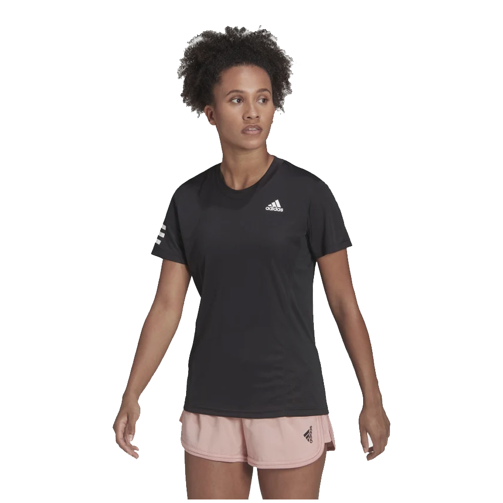 Adidas Womens Club T-Shirt (Black) Cutting-edge performance and country club style partner up on court in the adidas Club collection. This tennis t-shirt is all about reducing distractions. Mesh side panels encourage airflow, and AEROREADY wicks moisture from your skin to add confidence to your game. If that’s not enough to help you put your opponents away, gussets under the arms give your shoulders the room you need for those big hits.