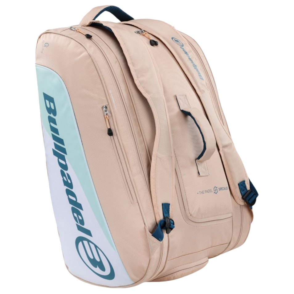 The ELITE racket bag combines sleek design with medium capacity. It features a main compartment for essentials, two thermo compartments for up to four rackets, a ventilated section for clothes and shoes, a small side pocket, and a top handle for easy carrying.
