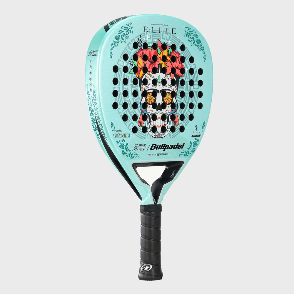 The Bullpadel Elite W MX Racket is designed as a tribute to the cultural richness and vibrant spirit of Mexico, blending art, tradition, and high performance. It uses an intense turquoise colour which stands out on the court, while the graphic elements symbolise the life, strength, and identity of the country. The design prominently features a striking skull adorned with colourful flowers, inspired by the iconic Day of the Dead celebration.