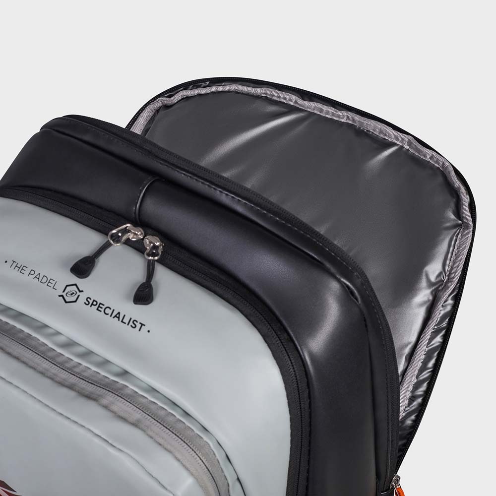 The Hack backpack is a professional-grade carrier designed in collaboration with Paquito Navarro to accompany the Hack 04 racket. It is built for demanding players who need a balance of high-tech protection and ergonomic comfort in a more compact format than a full racket bag.