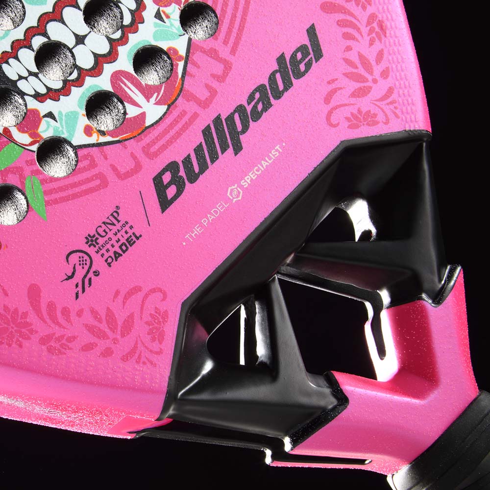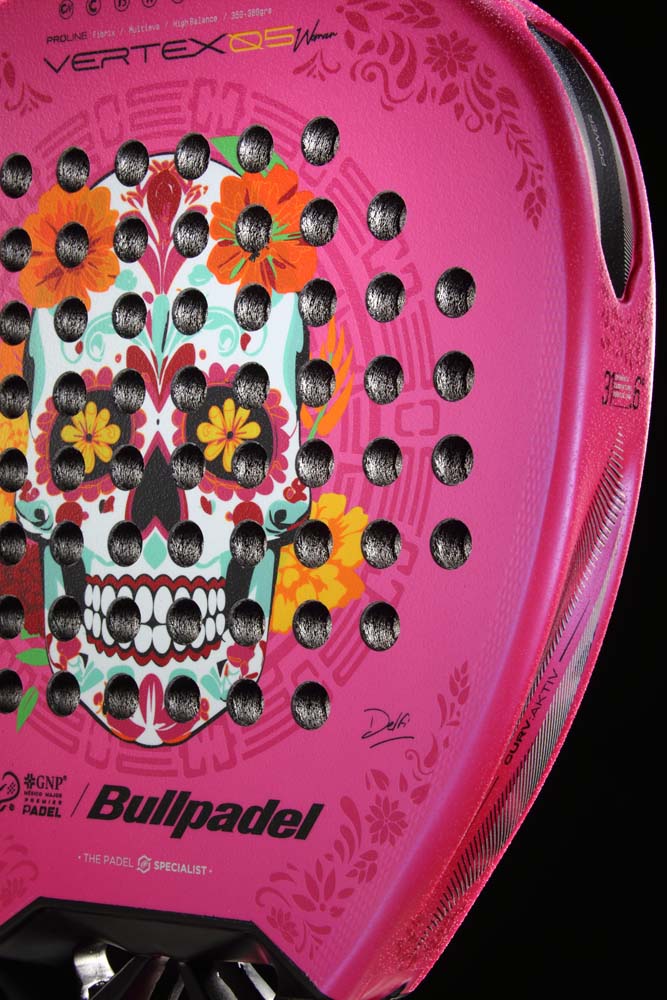 The Bullpadel Vertex 05 W MX Racket is a special edition that celebrates the strength and culture of Mexico with a vibrant, technically innovative design. It prominently features an intense pink tone and incorporates a striking floral skull inspired by the Day of the Dead, an icon representing life and passion. Warm tones and multicolored flowers complement the pink background, and the aesthetic is completed by ornamental details and a ‘VIVA MEXICO’ inscription.The Bullpadel Vertex 05 W Padel Racket is Delfi Brea’s newest racket. The racket shares the new diagonal double-bridge core with the rest of the Vertex 05 range, now with a more triangular geometry that optimizes the distribution of forces between the racket’s edges. The Vertex Core offers greater stability and control, allowing the player to deliver greater power and precision both from the baseline and at the net. The racket features a rough finish and a hesacore grip for increased spin and grip.