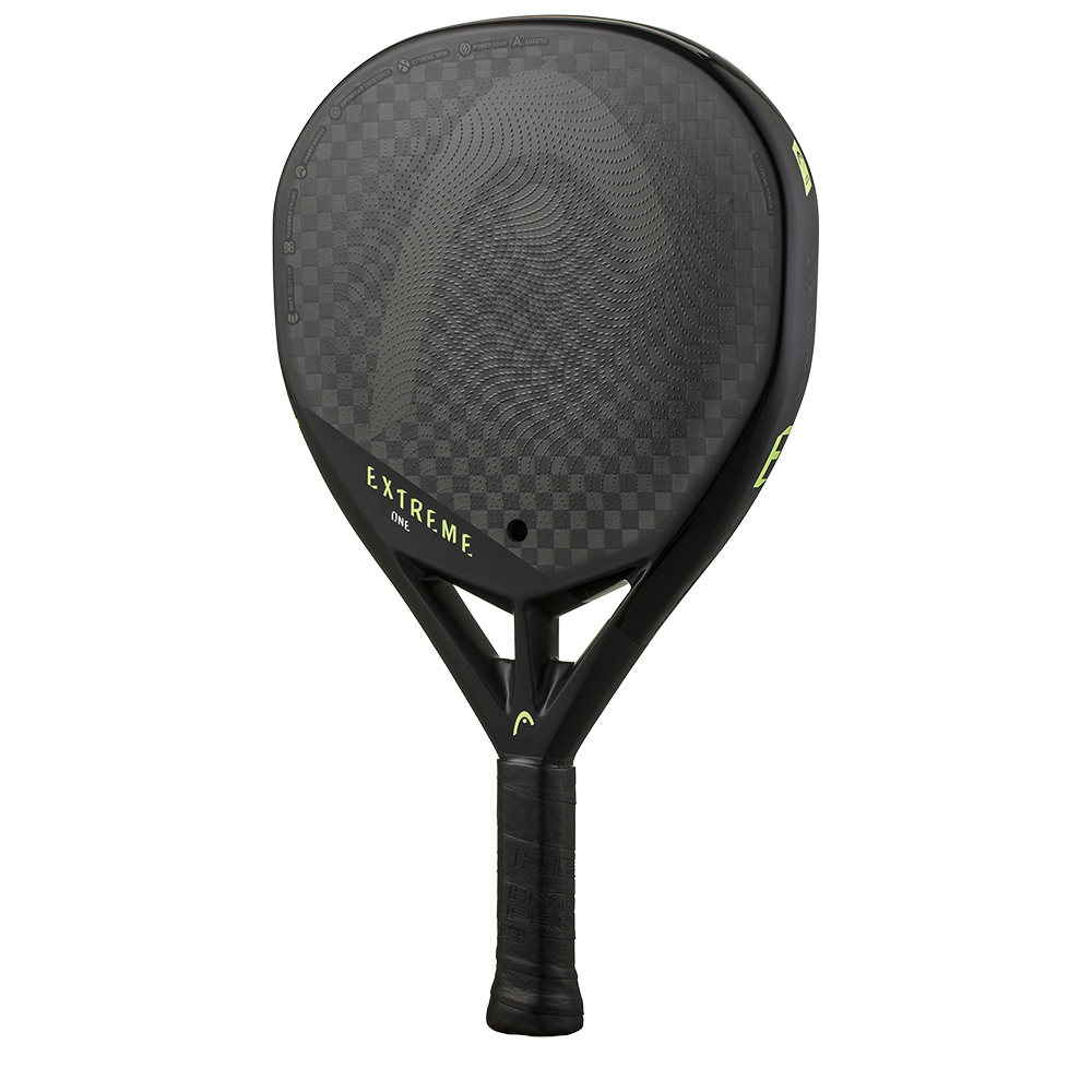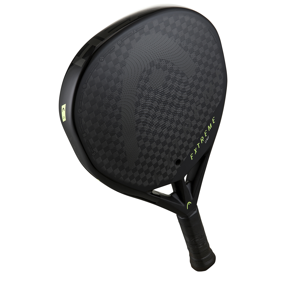 The revolutionary EXTREME ONE PADEL RACQUET is the lightest racquet in the EXTREME series; Head also state that it is also the strongest, with the state-of-the-art 12K carbon see-through unique hitting surface for added durability. Made from a new, diamond-shaped mold, this racquet is lightweight, as well as powerful and aerodynamic, and lets you play with consistent spin. The innovative Auxetic technology delivers extra power and a sensational impact feel. The Soft Butt Cap technology supplies a softer playing feel and dampens vibrations.
