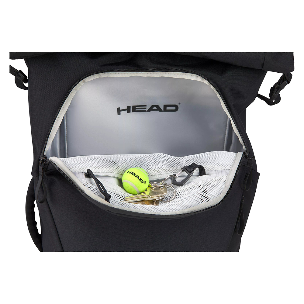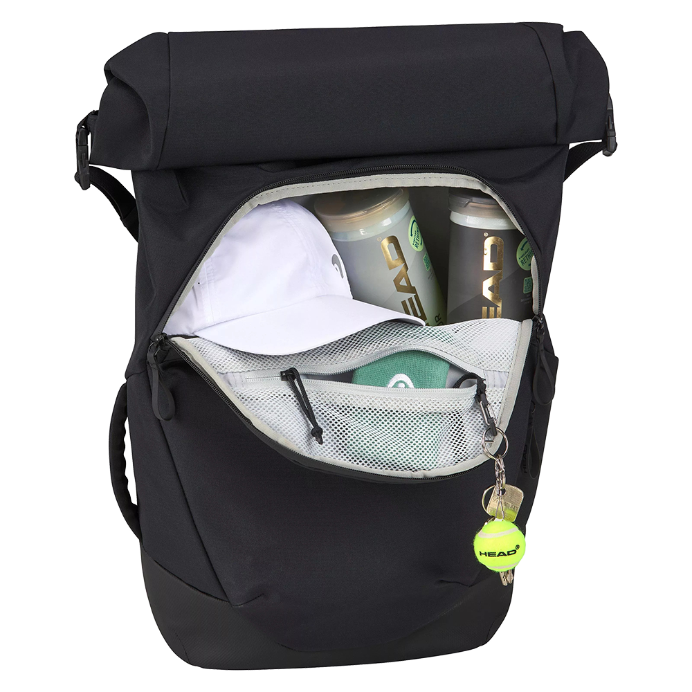 The new Pro X Racqpack backpack, made from recycled PET bottles, is a sustainable, versatile option for organizing your belongings on the go. It features a roll-top design, accessory pockets, a laptop compartment, and space for up to 3 racquets (Tennis, Padel, Squash, Pickleball, Badminton, or Racketball) with CCT+ climate control technology. The EVA construction and adjustable chest buckles ensure comfort. HEAD also highlights its commitment to sustainability with recycled paper hangtags and hemp cord.