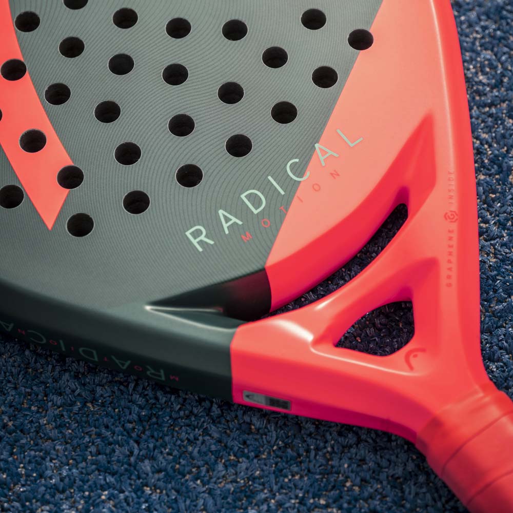 The RADICAL MOTION 2026 is a padel racket designed for advanced and competitive players seeking an optimal balance of precision and manoeuvrability. Its light weight and low balance contribute to a smooth, controlled feel during play. Similar to the PRO model, it incorporates a double layer of carbon fibre, Auxetic 2.0 technology, improved Control Foam, and a new hole pattern to enhance stability and feel upon impact. The Radical 2026 series is a launch that combines lightness, control and versatility. This range adapts perfectly to competitive players looking for tactical precision on the court.