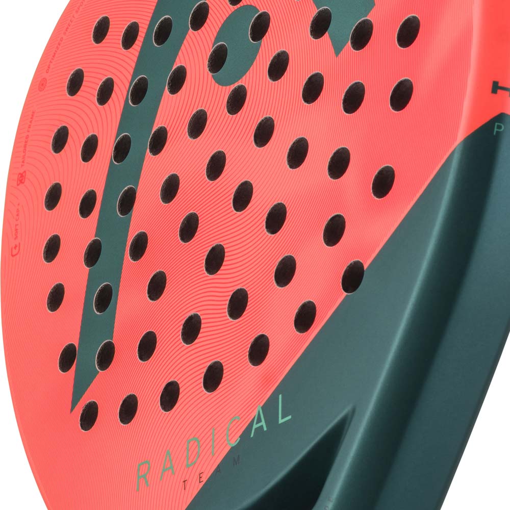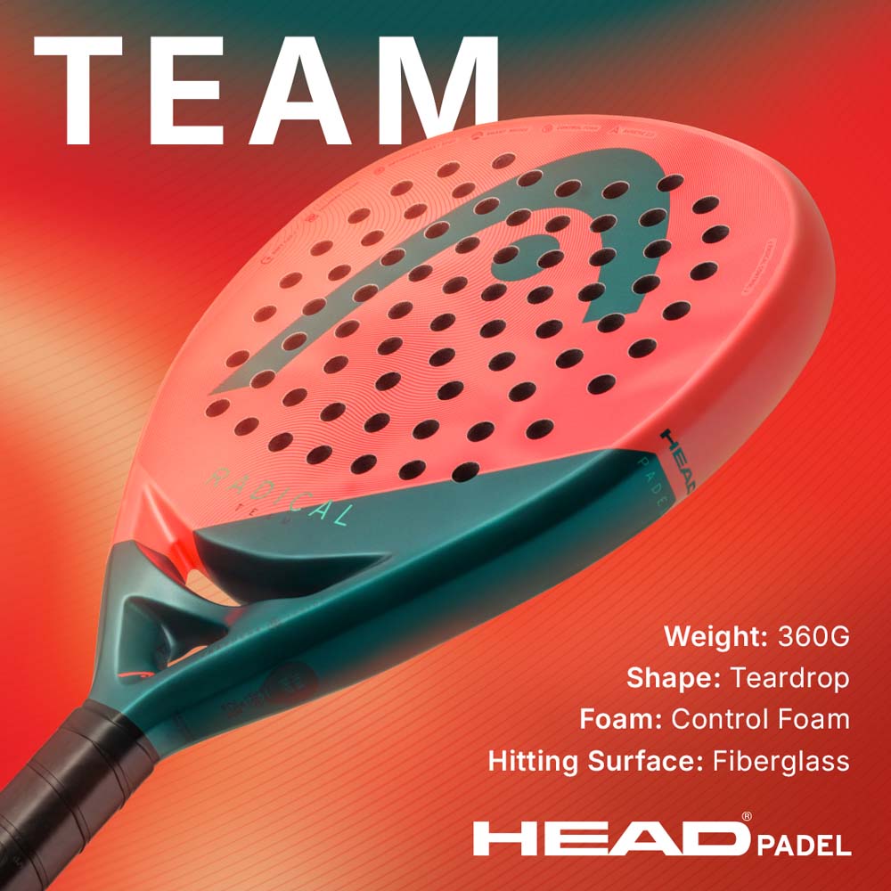 The RADICAL TEAM 2026 padel racket is ideal for intermediate to advanced players looking for a tactical and balanced game with a slightly softer touch. It features a fibreglass hitting surface that ensures a comfortable and forgiving feel, and a low balance design to enhance manoeuvrability. The 2026 padel is updated with Auxetic 2.0 and renewed Control Foam, and also offers the convenience of an interchangeable strap system at the handle.