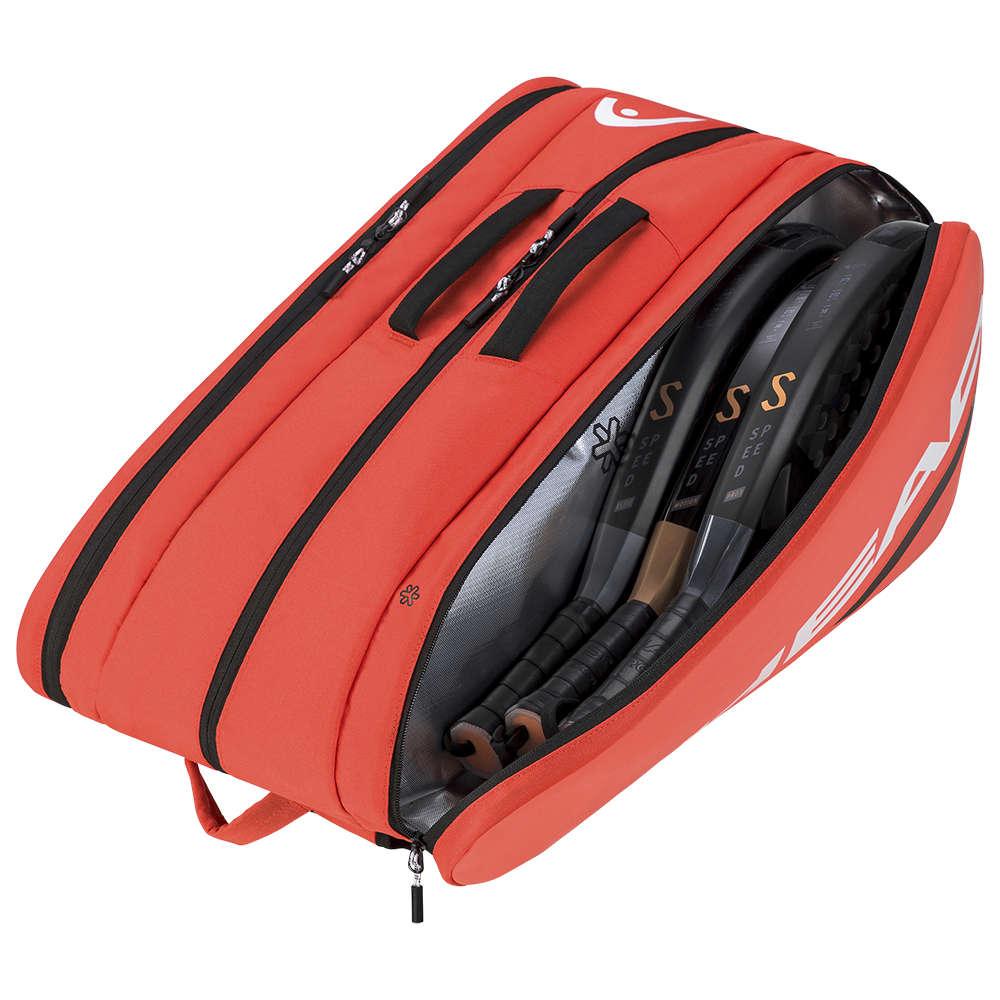 Style, space and innovative technology are combined in the TOUR PADEL BAG L . Offered in a Bold Orange Colour the bag has been upgraded with a new shape, new padding for extra stability and new top handles.