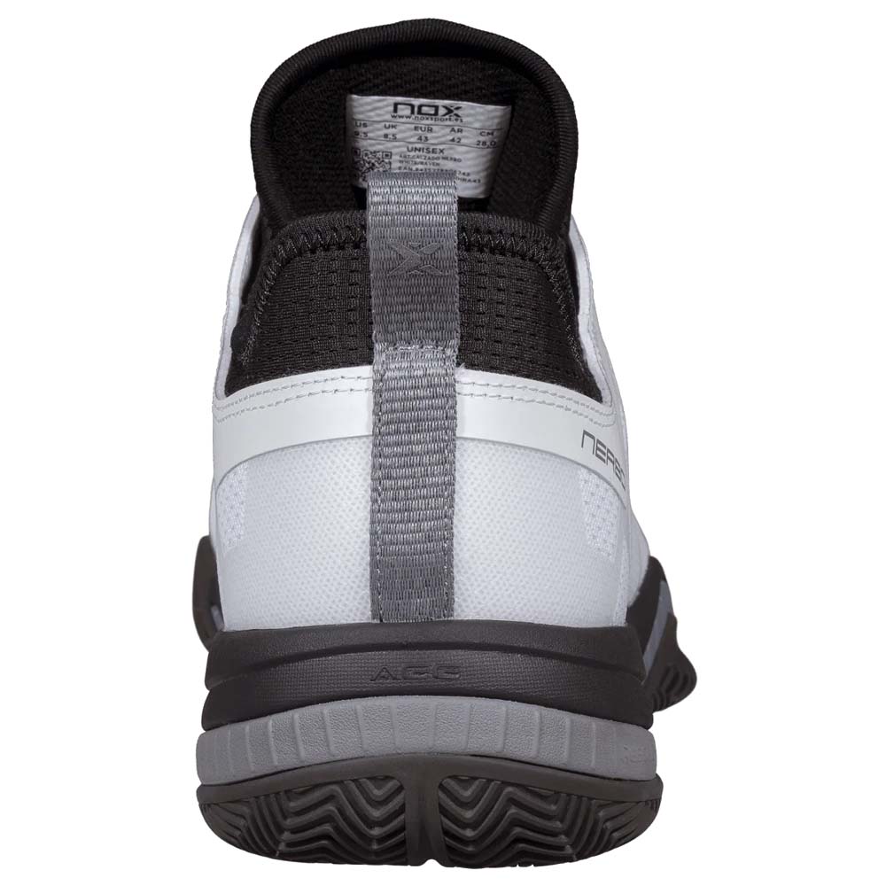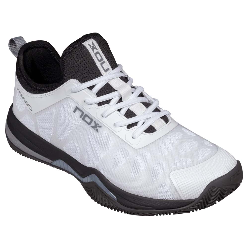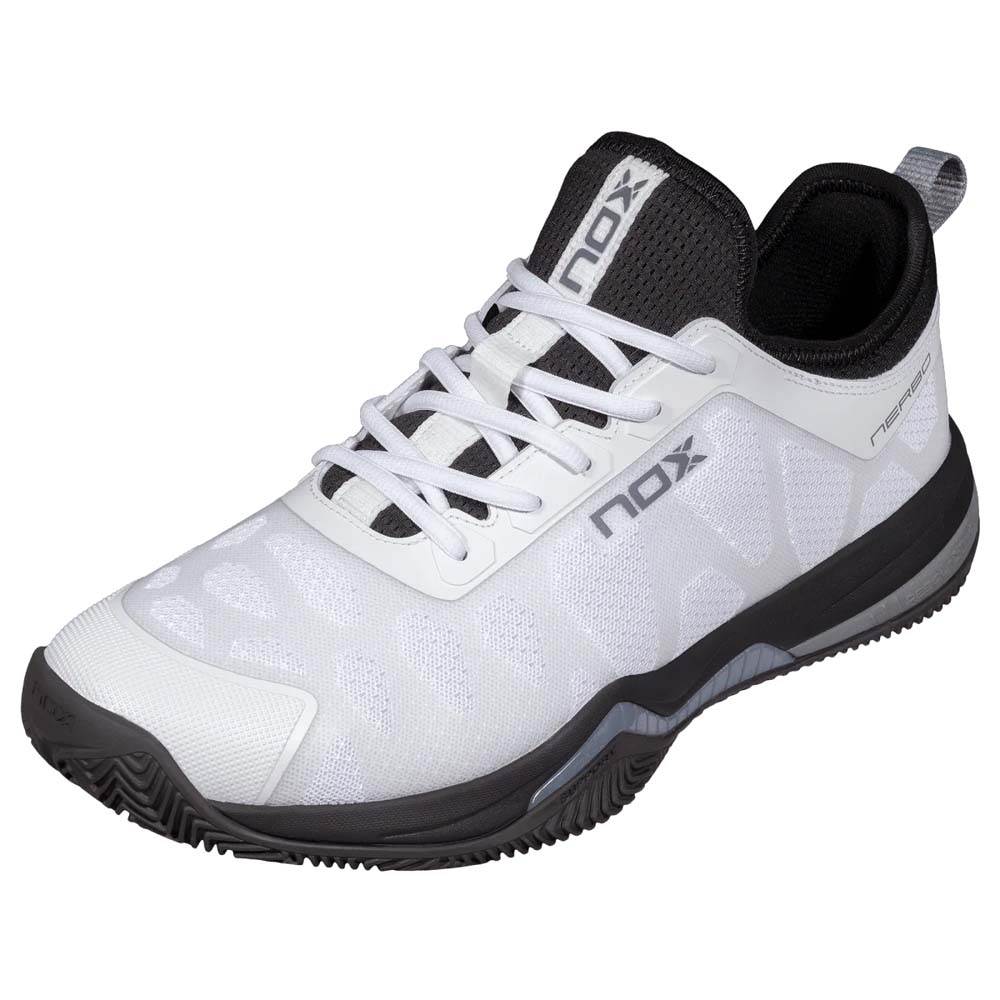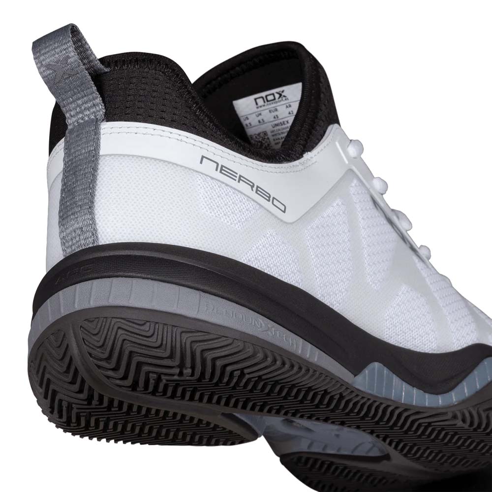 The Nox NERBO White/Raven padel shoes are engineered for maximum speed and explosive movement. Clinically endorsed by elite sports podiatrist Marta Rueda and certified by the INESCOP Technology Centre, this model focuses on a secure fit for players who prioritise jumping and sprinting.