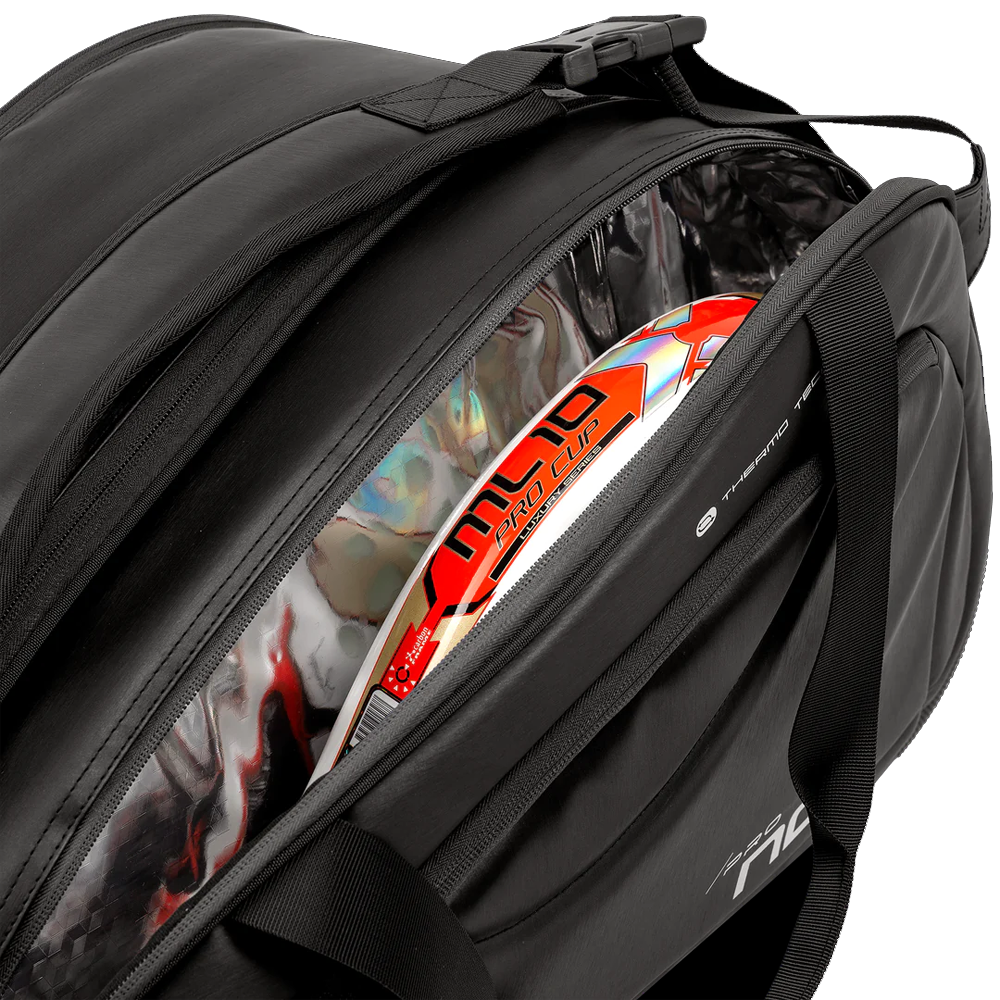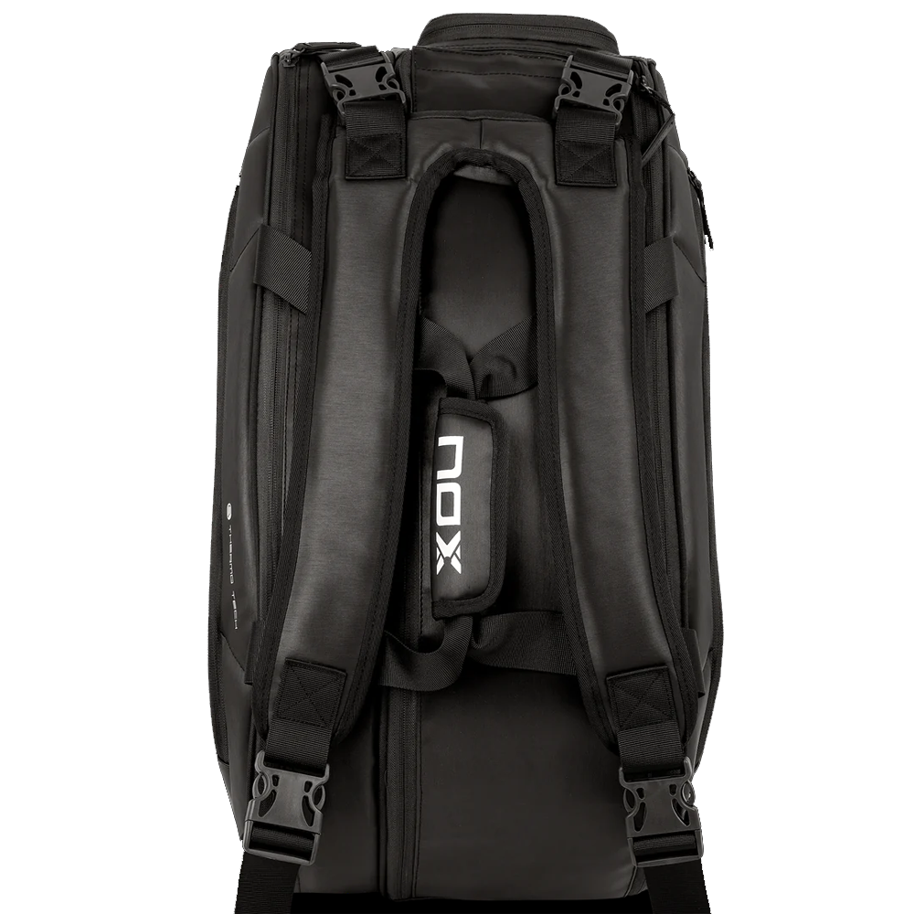 It has a thermal compartment (Nox TermoTech technology) to protect your rackets from heat, a main compartment with double zipper for easy access to the interior, independent compartment for shoes with ventilation opening, side compartments.