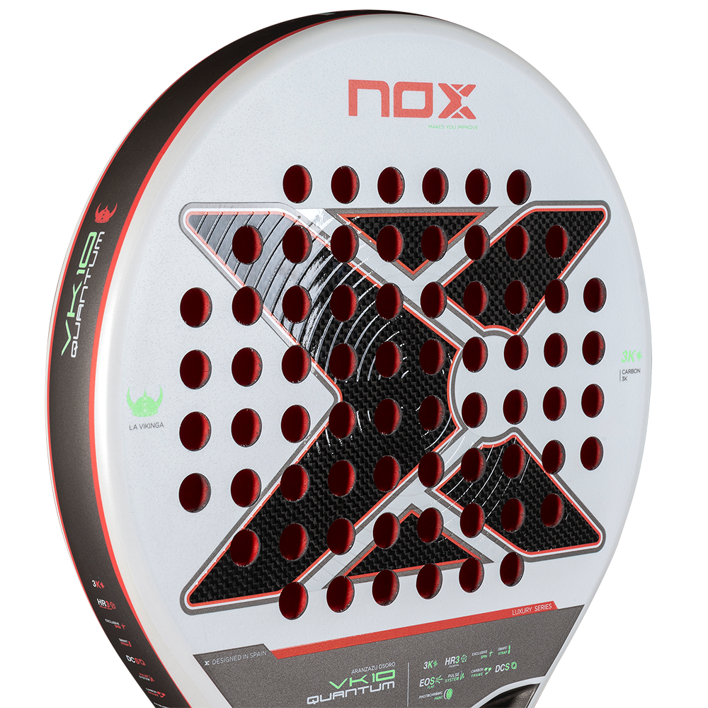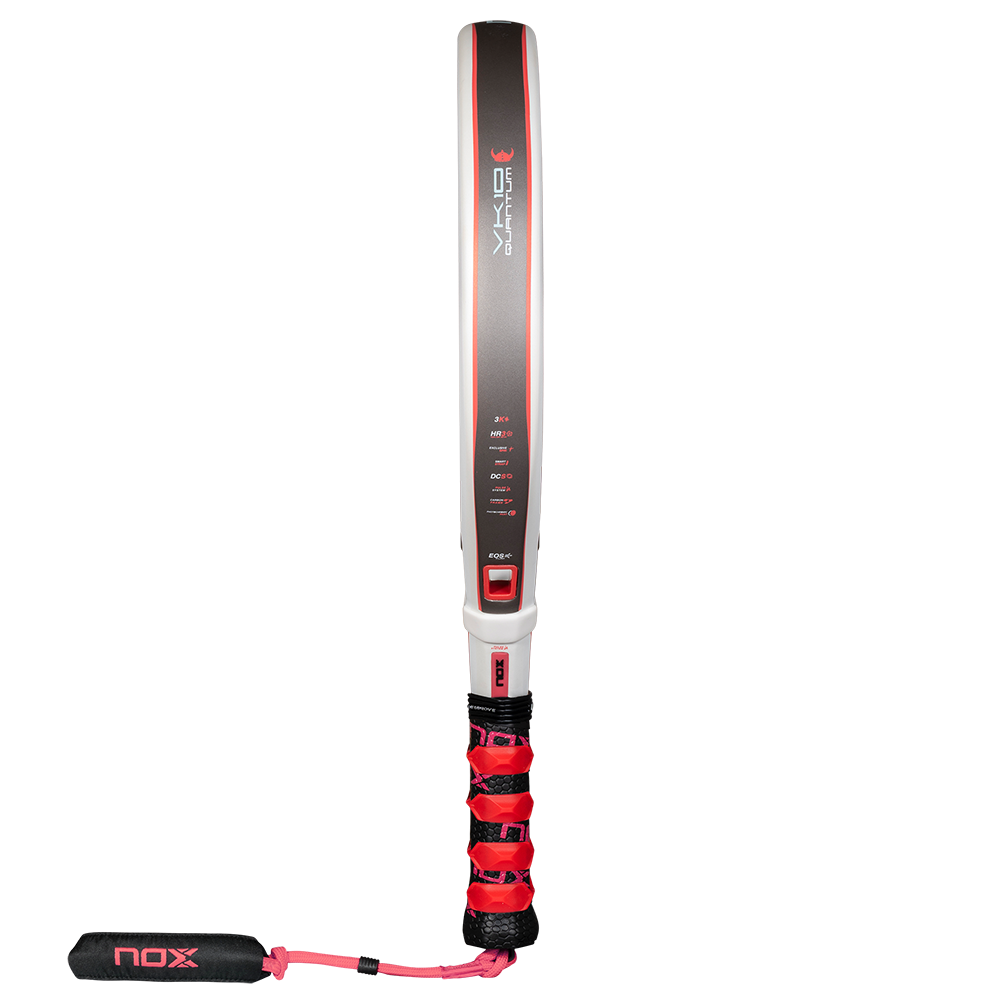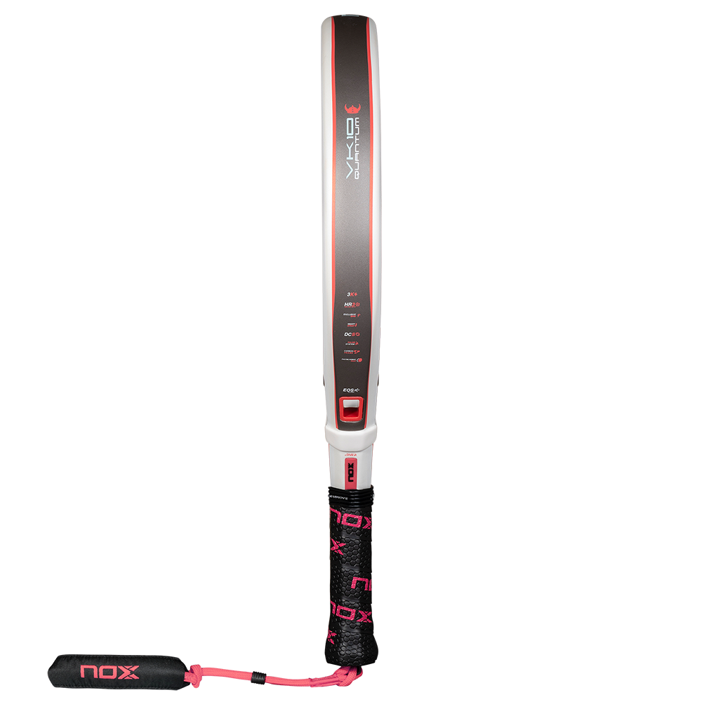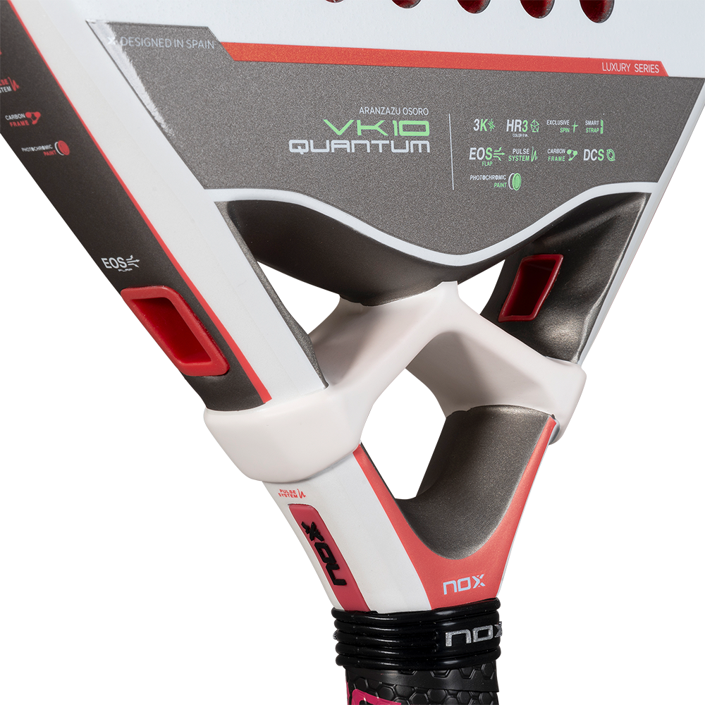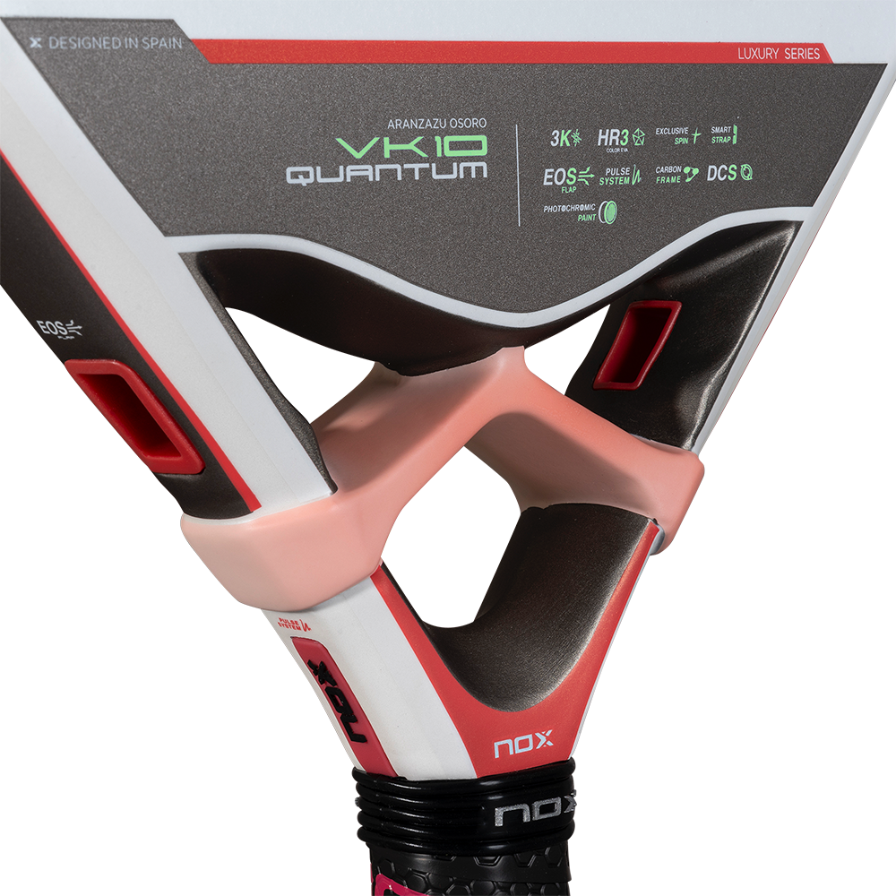 The VK10 Quantum 3K, designed for Aranzazu Osoro, is based on the ML10 Quantum 3K but lighter (350-365g), perfect for players needing speed and precision. It features Photochromic Paint for a striking look, 3K Carbon Fiber, and HR3 Core for an adaptable, intermediate feel. The EOS Flap enhances maneuverability, while NOX Custom Grip® and Smartstrap® reduce vibration, improve grip, and offer customizability.