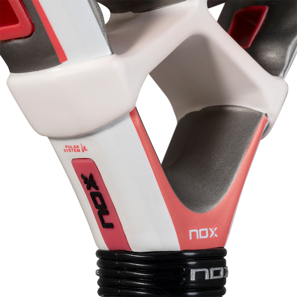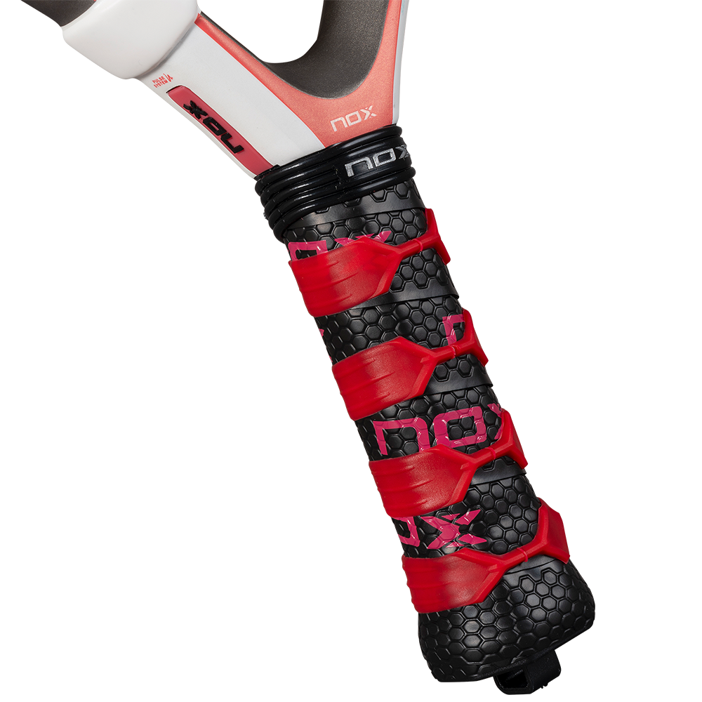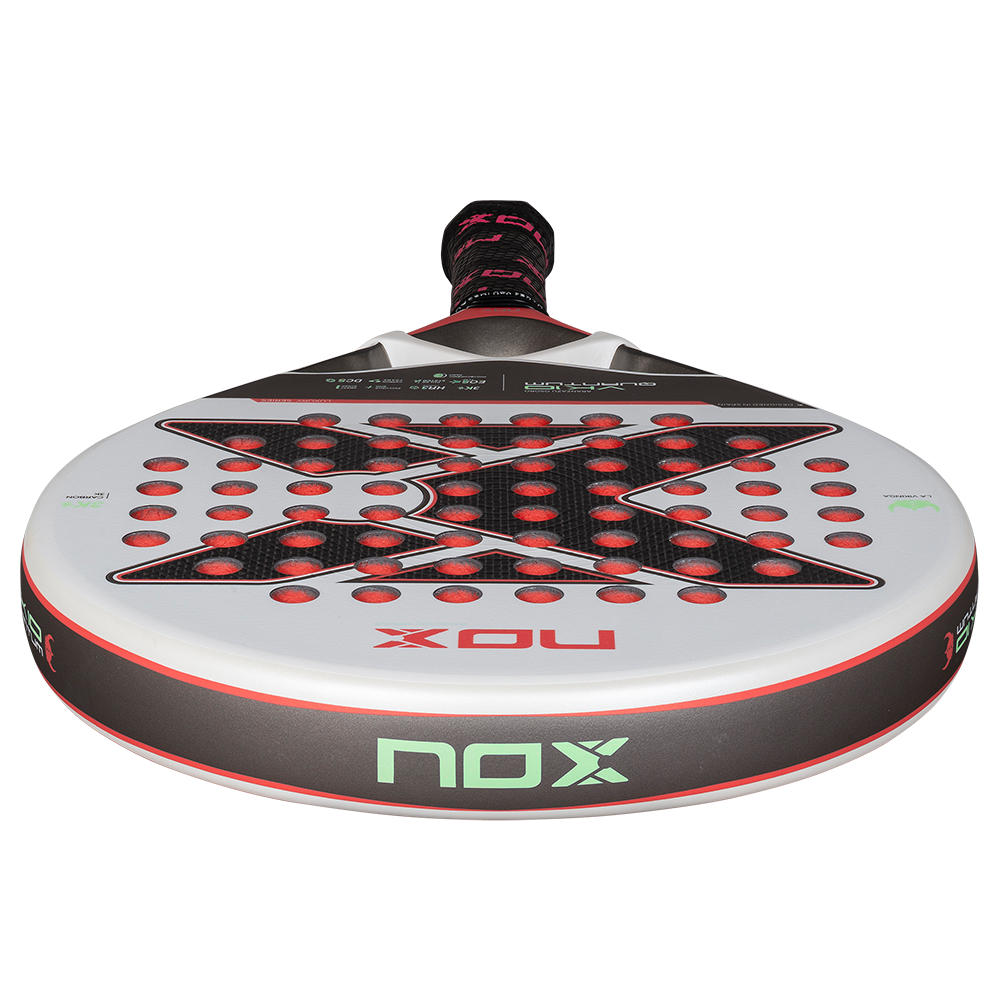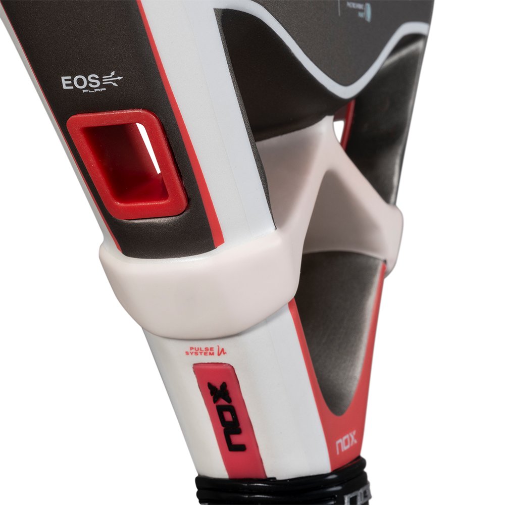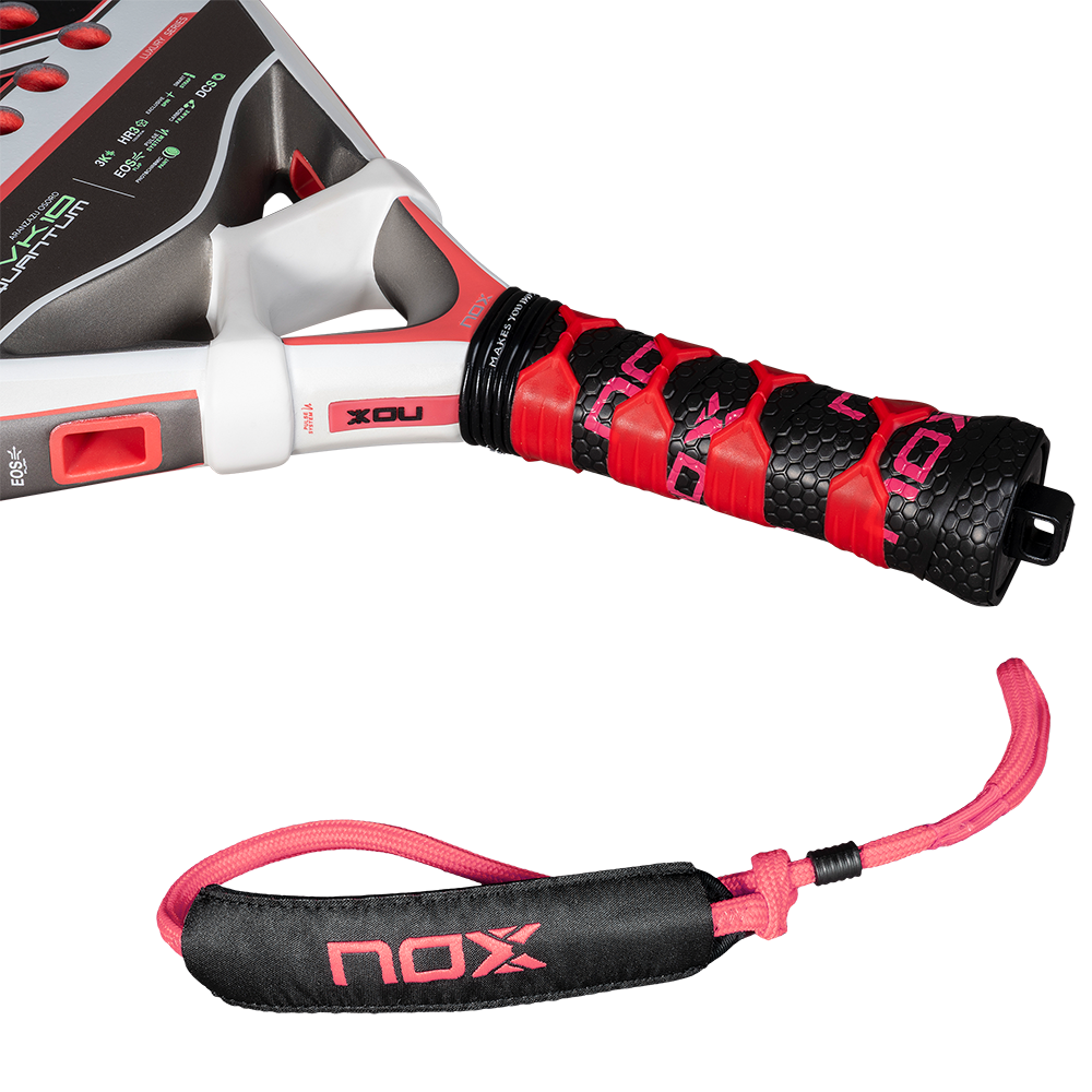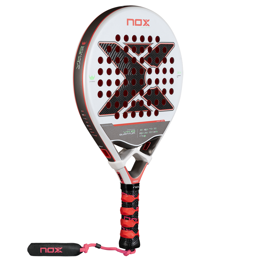 The VK10 Quantum 3K, designed for Aranzazu Osoro, is based on the ML10 Quantum 3K but lighter (350-365g), perfect for players needing speed and precision. It features Photochromic Paint for a striking look, 3K Carbon Fiber, and HR3 Core for an adaptable, intermediate feel. The EOS Flap enhances maneuverability, while NOX Custom Grip® and Smartstrap® reduce vibration, improve grip, and offer customizability.
