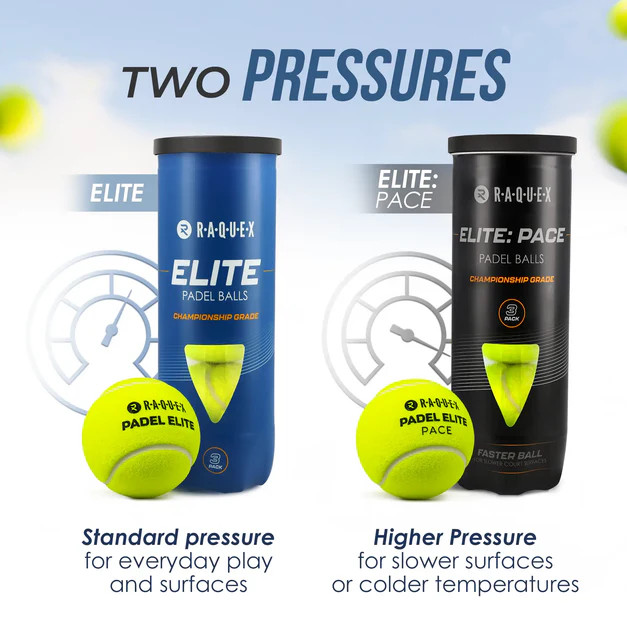 Available in two pressure options, Raquex Elite balls let you tailor performance to your playing conditions. Elite padel balls offer standard speed, perfect for slower courts or colder environments, while Elite: Pace delivers a faster response for more competitive, high-intensity gameplay.