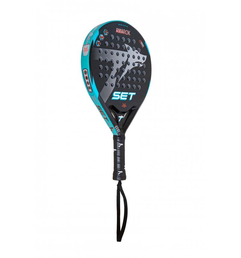 The SET Amarok Padel Racket 2025 is a control-focused racket crafted for medium-high level players. It uses a round mould to maximise precision and features a glossy finish complemented by rough sand for adding spin and effect to the ball. The face is constructed from three layers of interlocking fibreglass, which, combined with a premium rubber core, gives the racket a great ball output (speed/rebound). In summary, it balances high precision and spin with a powerful, responsive core.