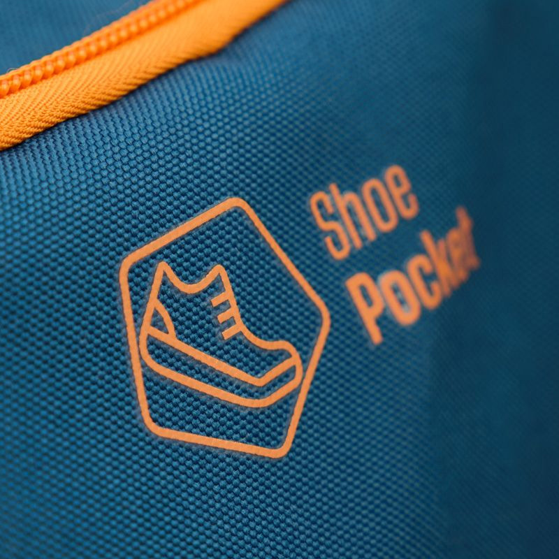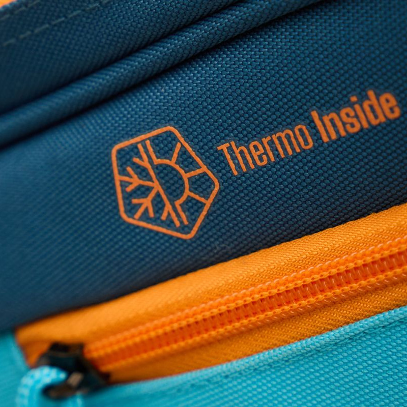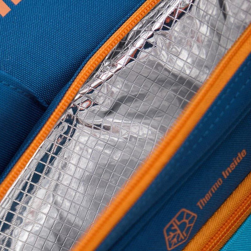 The Starvie Pro Master padel bag is a large-capacity, comfortable, and organized bag with a sporty design in blue with orange accents. It features two Thermotech racket compartments to protect rackets from temperature changes, a separate ventilated shoe compartment, and a side pocket for small accessories. The bag has a dual carrying system with padded handles and backpack straps. Its dimensions are 62 x 32 x 35 cm, and it is constructed from Polyester and Polyester Basket materials.
