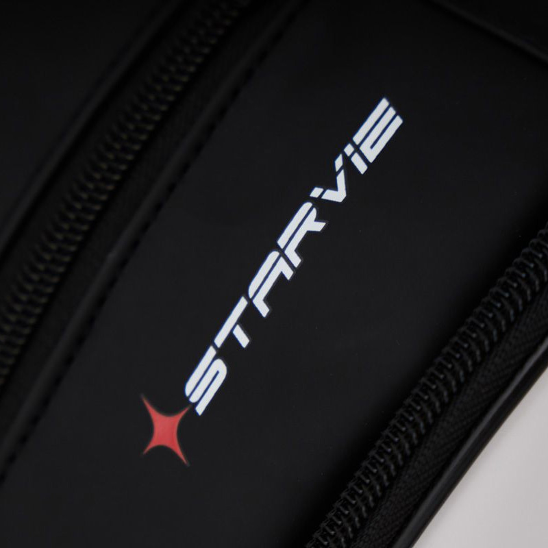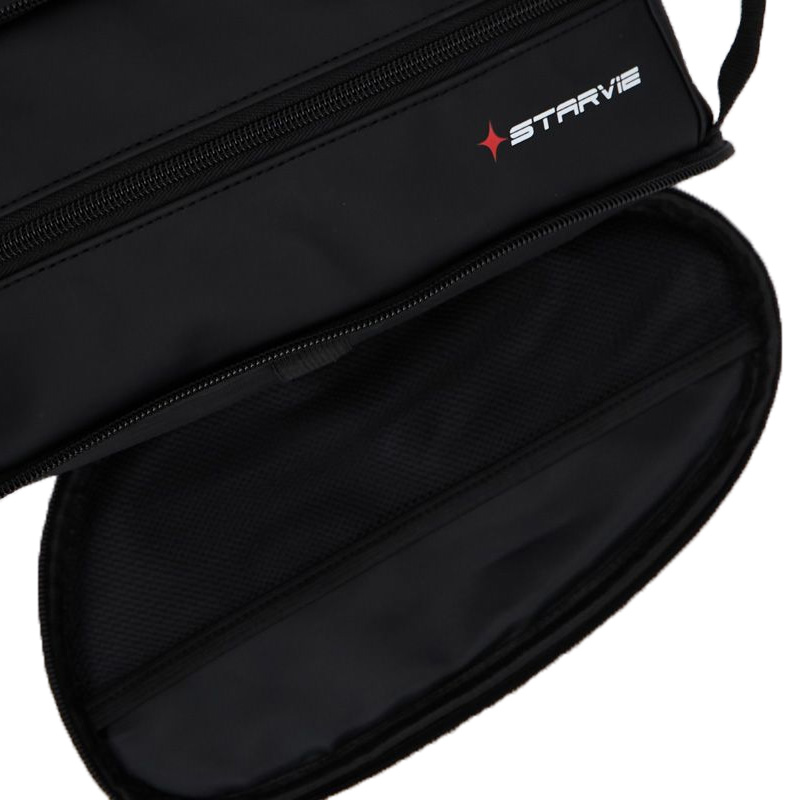 The STARVIE Wave padel washbag features an elegant black design with white details and the iconic red star. It includes a spacious central compartment and two additional side pockets to help organize smaller items. A functional accessory with personality, perfect for training, travel or daily use.