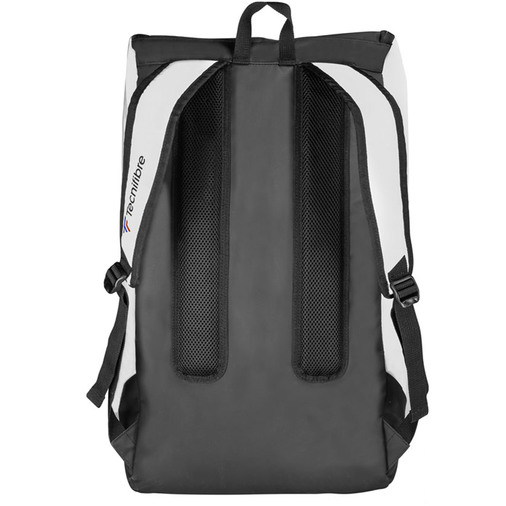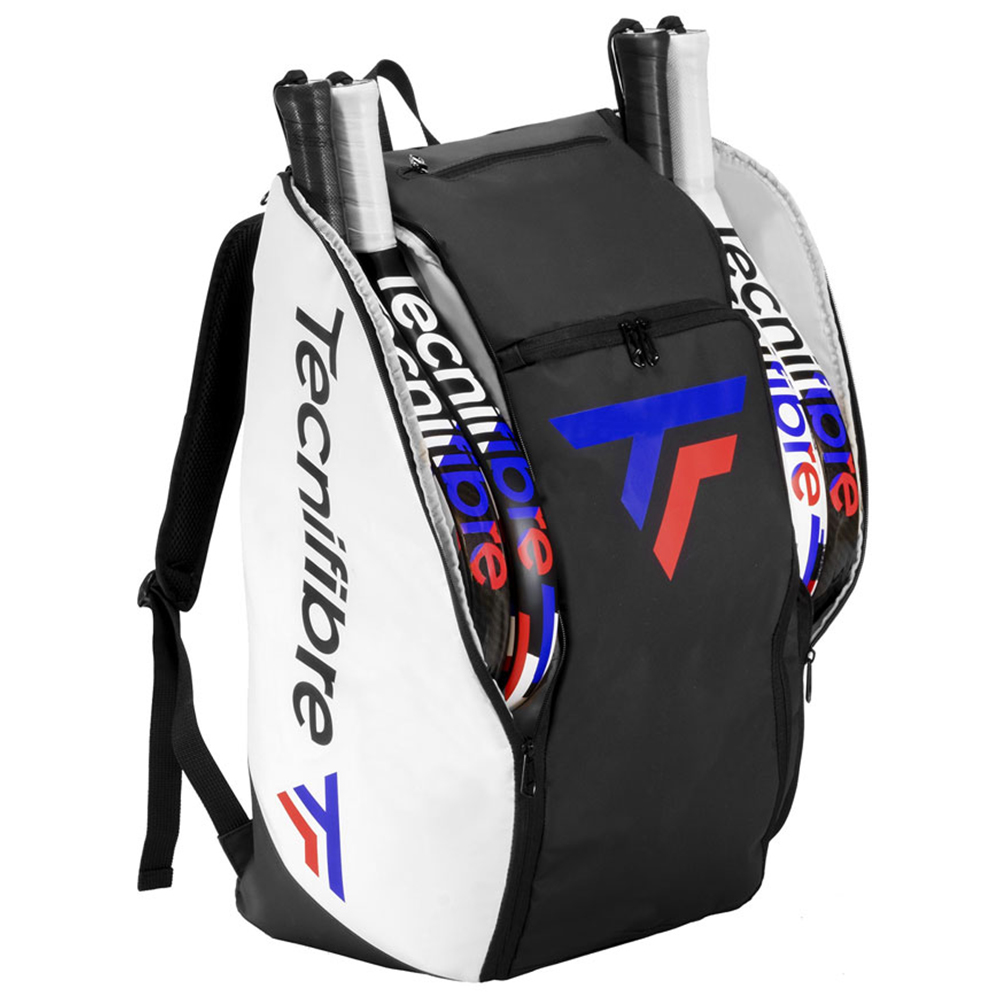 The perfect compromise between the capacity of a racquet bag and the practicality of a backpack. It stands upright for easy access to all pockets. It consists of two large pockets on each side for two rackets and a large central pocket for all additional items.
