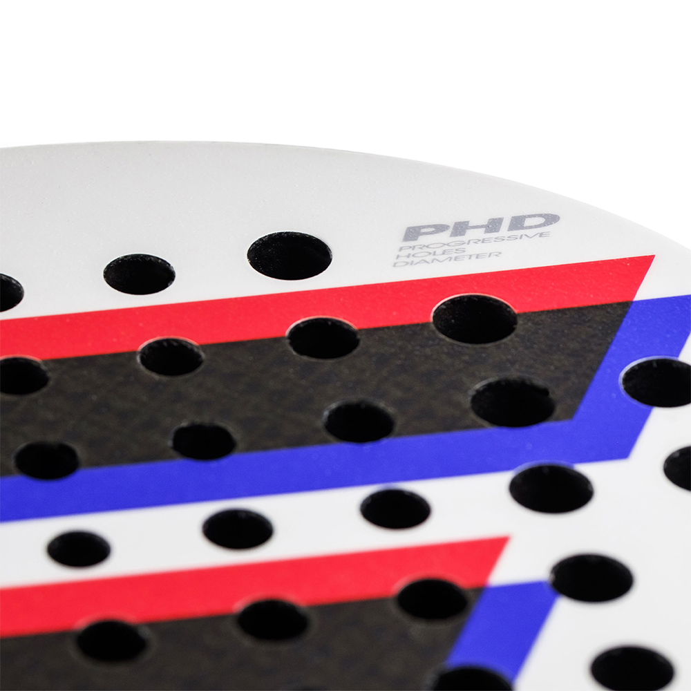 PHD hole pattern with 3 different hole diameters to maximise accuracy in the centre and tolerance to off-centre hits at the tips. Unique innovation from Tecnifibre with the racket head designed with “X-TOP” technology, a mix of the strongest aramid fibres covered with a PTFE treatment to limit abrasion.