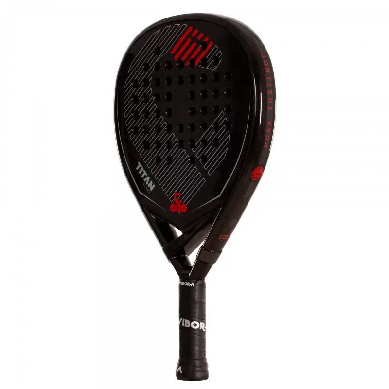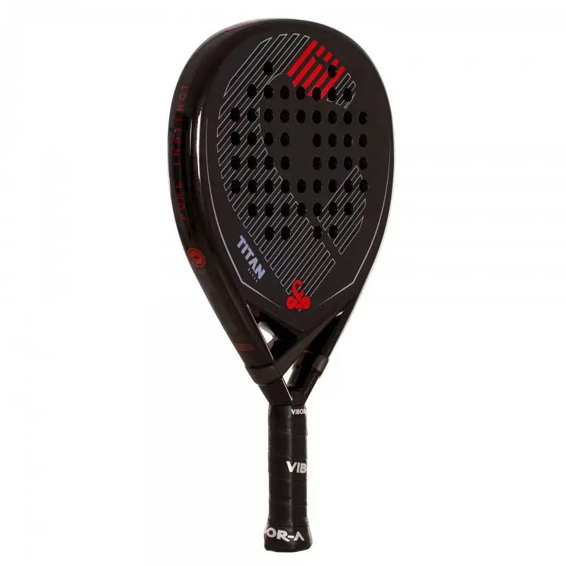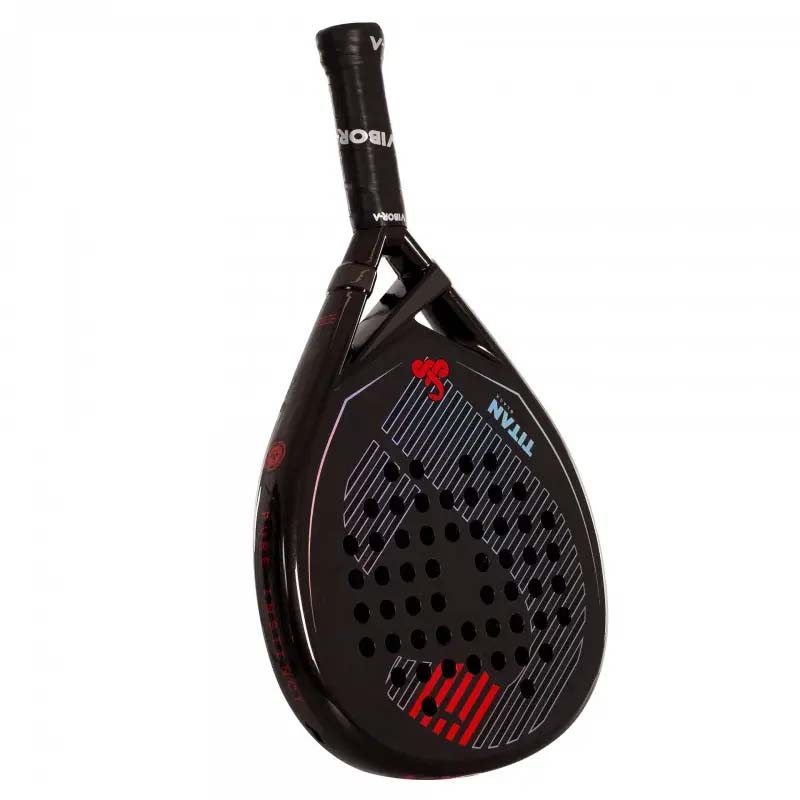 The Vibor-A Titan 15K Black Twill Padel Racket is a high-performance padel racket that is defined by its redesigned hybrid shape and glossy finish. This innovative shape, coupled with an even balance, is engineered to achieve an optimal balance between control and a large impact surface, making it highly adaptable for various playing styles. This enables precision defensively and power when attacking.